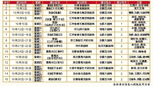 本报讯 “百戏入皖·星耀合肥”戏曲主题活动将于9月28日正式启动,合肥市将开展多场名家名角名剧惠民展演,为广大观众带来一场“跨年度、高品质、惠民性”的戏曲文化盛宴。目前,10月演出排期已出炉(见右表)。